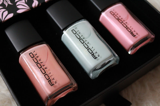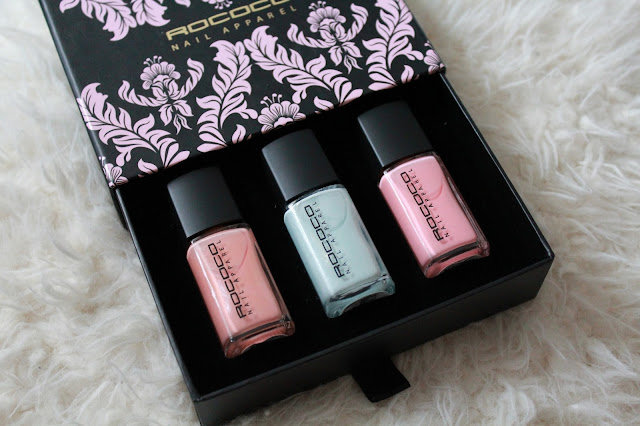 One of the main things I love about this Rococo nail set is how cute the packaging is. The trio of nail varnishes come set within a shelved box, that pulls out to reveal the selection of shades. All of the varnishes are perfect pastels for spring, with a light peach, mint green and baby pink, Peaches, T-Cup and My Cupcake. Peaches and T-Cup both have a subtle, gorgeous golden sparkle to their finish, which makes them catch the light and glisten. My Cupcake, the baby pastel pink shade is entirely pink and a basic pink shade to keep in your nail collection. The longevity is actually really good and after trying Peaches, it lasted on my nails really well without peeling away. Of course any nail varnish is likely to chip if you are using your hands for a number of tasks, but this one definitely stayed put for longer than the majority. I was actually quite impressed and I would say my favourite is definitely T-Cup for how subtle and cute the mint green shade is for summer. I think this would be such a lovely gift for someone and if not, a lovely treat for yourself.