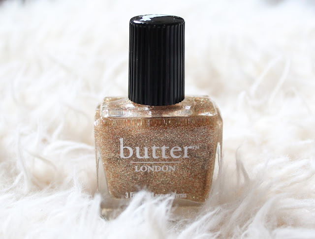 I recently found this buried inside a Harvey Nichols goodie bag I received with my flatmate for spending a considerable amount in HN. I have used Butter London before and loved it so I was excited to find another pot, this time in a beautiful shimmering gold. The first thing I really like about Butter London polishes are the bottles. There is something really elegant and sophisticated about the rectangular body and detachable lid that hides the brush wand inside. The brush is quite thin and allows for precision polishing, yet smaller brushes do take longer for you to paint your nails. You win some, you lose some I guess. But the actual colour of the polish is gorgeous, as you can see. The west end wonderland shade blends pieces of gold, silver and small amounts of red glitter, so that your nails shimmer in the sunlight. I absolutely love the mix and this is by far the nicest gold polish I own. The staying power of Butter is also great, and with a top coat of clear polish over this it should stay put for a number of days.
