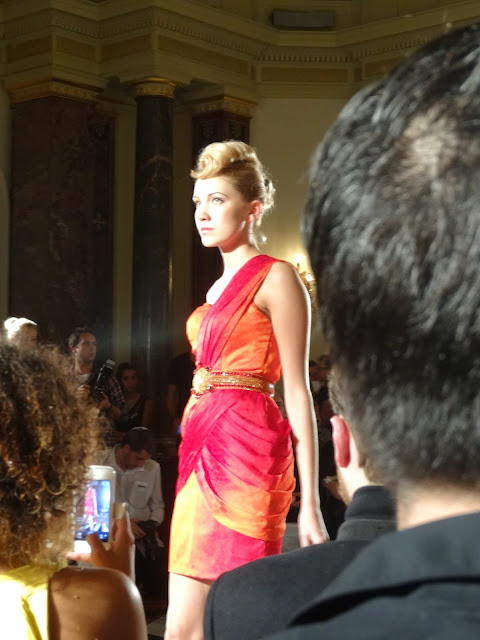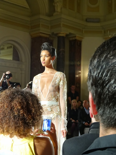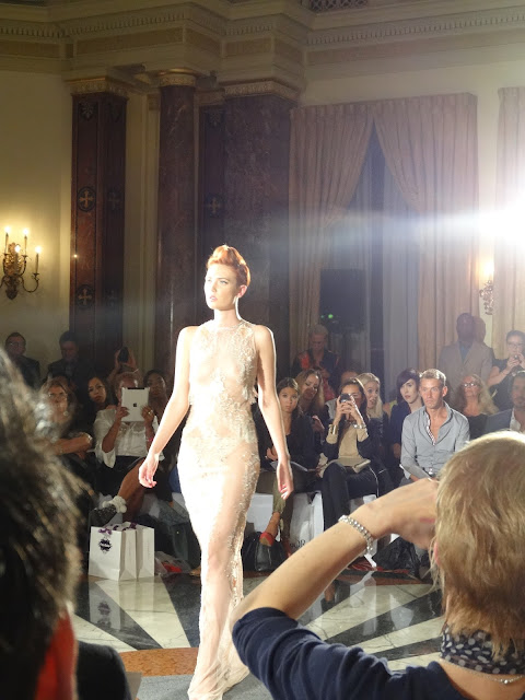 Then I was off to my first show with Fashion International. They showcase new up and coming labels and give new creatives an opportunity to show off their talents alongside the huge designers. Wajahat Mirza, Aga, Yuvna Kim, Dee Duce and Gianni Lilliu all had their chance at the spotlight, each showing their newest collections to a packed out suite. The first image from Wajahat Mirza’s eveningwear collection, inspired by exotic birds in bright and bold colours. The second, third and main image at the top of the page were taken of Yuvna Kim’s beautiful collection of nude and ivory evening gowns, embroidered with crystals, pearls and feathers. So many beautiful pieces from all of the designers and it was fantastic show to watch. Im sure Pandemonia thought so too.