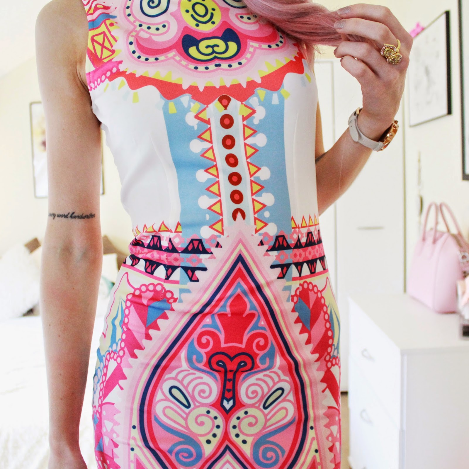 Pink, pink and more pink. And then I added the bag. Quite frankly, I don’t care if Im wearing pink in every aspect of my outfit as long as I feel good in what Im wearing. I know most other people wouldn’t team pink on pink with pink hair, but I guess I’m not most people. The dress is from Stelly.com, an Australian brand I recently stumbled across and absolutely adore. Is it just me or are Australian brands killing it right now?! So many amazing on trend and summer pieces from over there and its just getting me so excited for summer holidays. I added my beautiful Olivia Burton watch and some gorgeous beige wedges from Missguided that I am just adoring right now. Finally I adorned my finger in the most stunning ring I have ever worn. From Lolo and Galago, this spice trail ring is just so special and a true statement, talking piece. If you’re a lover of gold and sparkly rings, then you may fall in love with this.