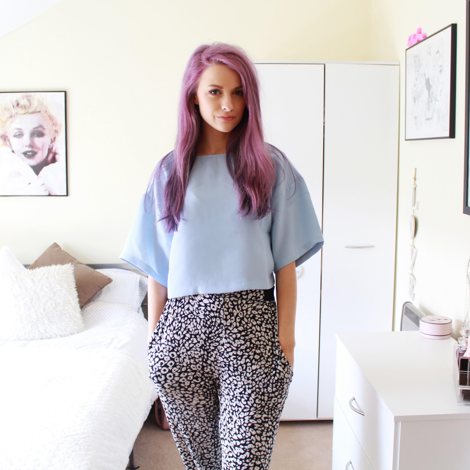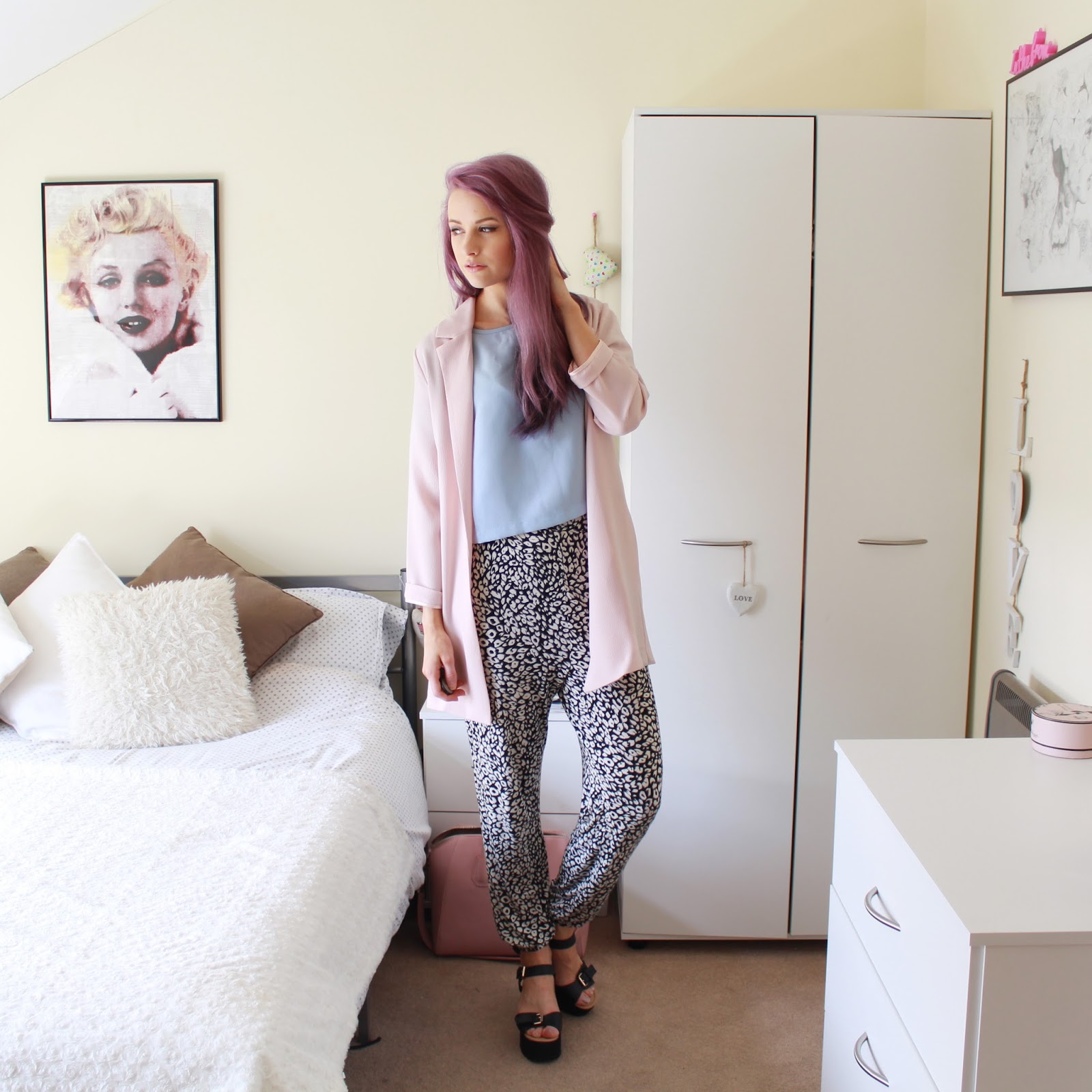 I really love throwing colours together at the moment, so I loved the way that the baby blue and dusky baby pink seemed to fit so nicely together. Breaking up the colours with some monochrome, I wore these lightweight jersey trousers that gather at the waist for a super comfortable piece. I also wore some black wedged sandals for a summery vibe and again to break up the colours, but the focal piece is definitely the stunning pink duster jacket. So light, cool and just a slight touch of pastel colour, perfect for piecing with shorts or trousers like these for a warmer summer.