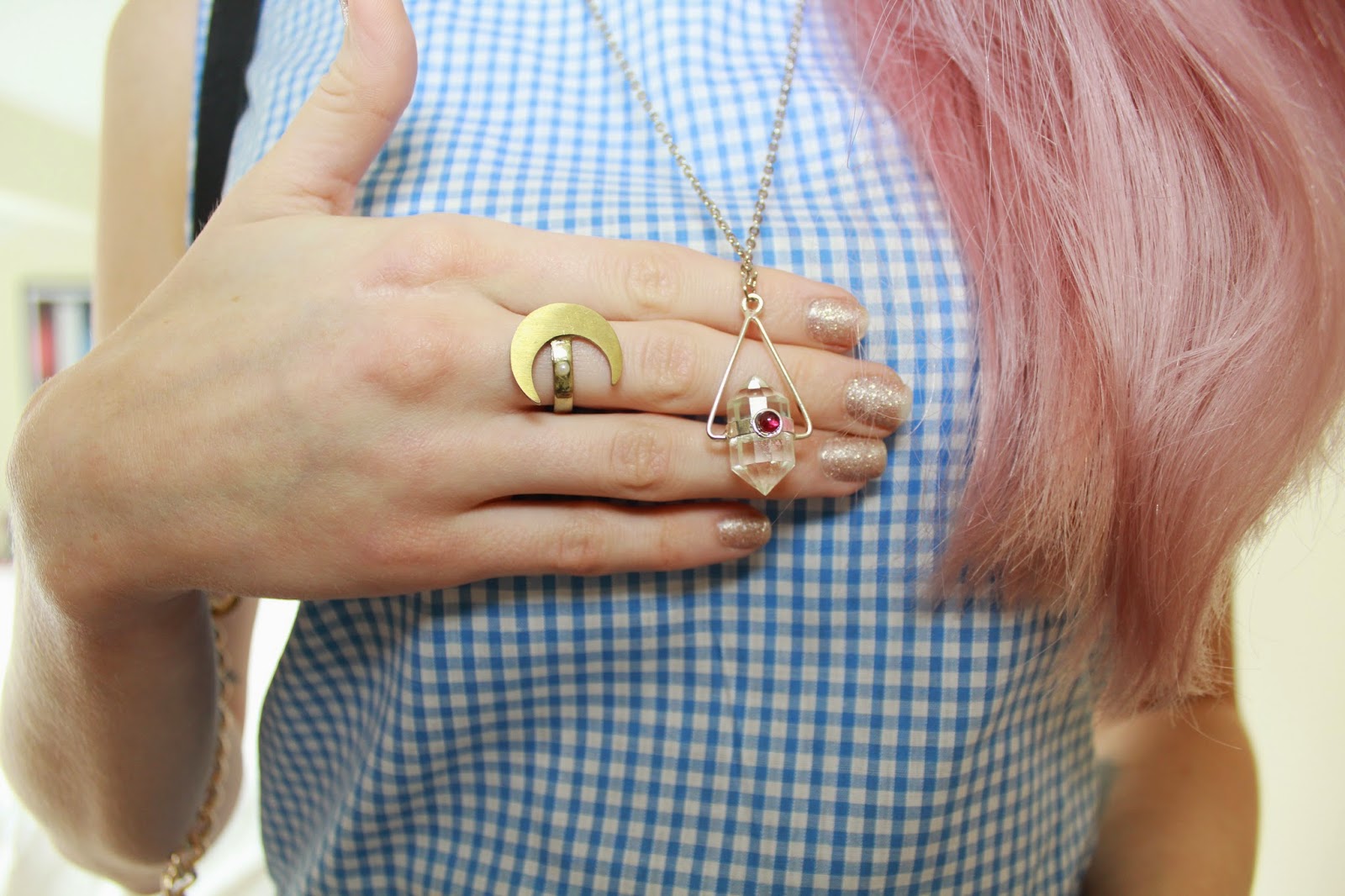 I don’t own much light blue and I really should because I love it. In this cute check pattern, its just so adorable and Im loving coords right now. The flatforms are also a recent fave, especially as I’ve spent the last 6 months in boots, this was a welcomed change for my toes. For going out, Id throw on a denim jacket or a mid length jacket and of course some sunnies. But for now I teamed it with some gold and silver jewellery, fancy that, and my gorgeous custom made Baia.