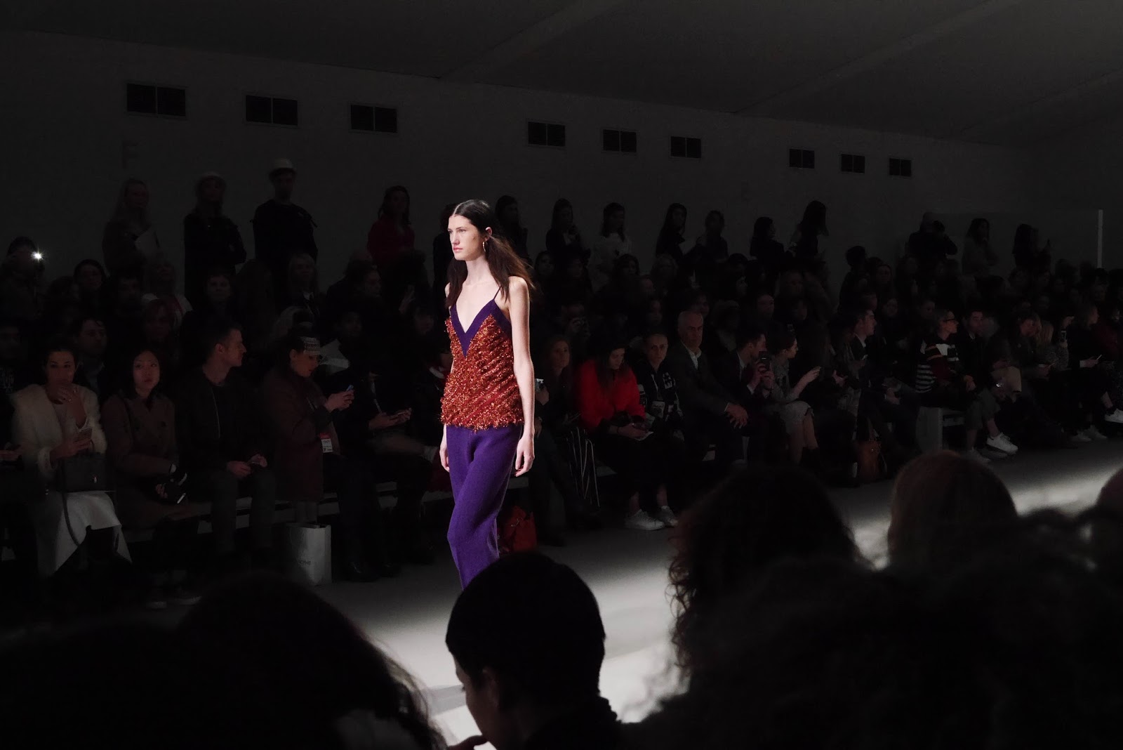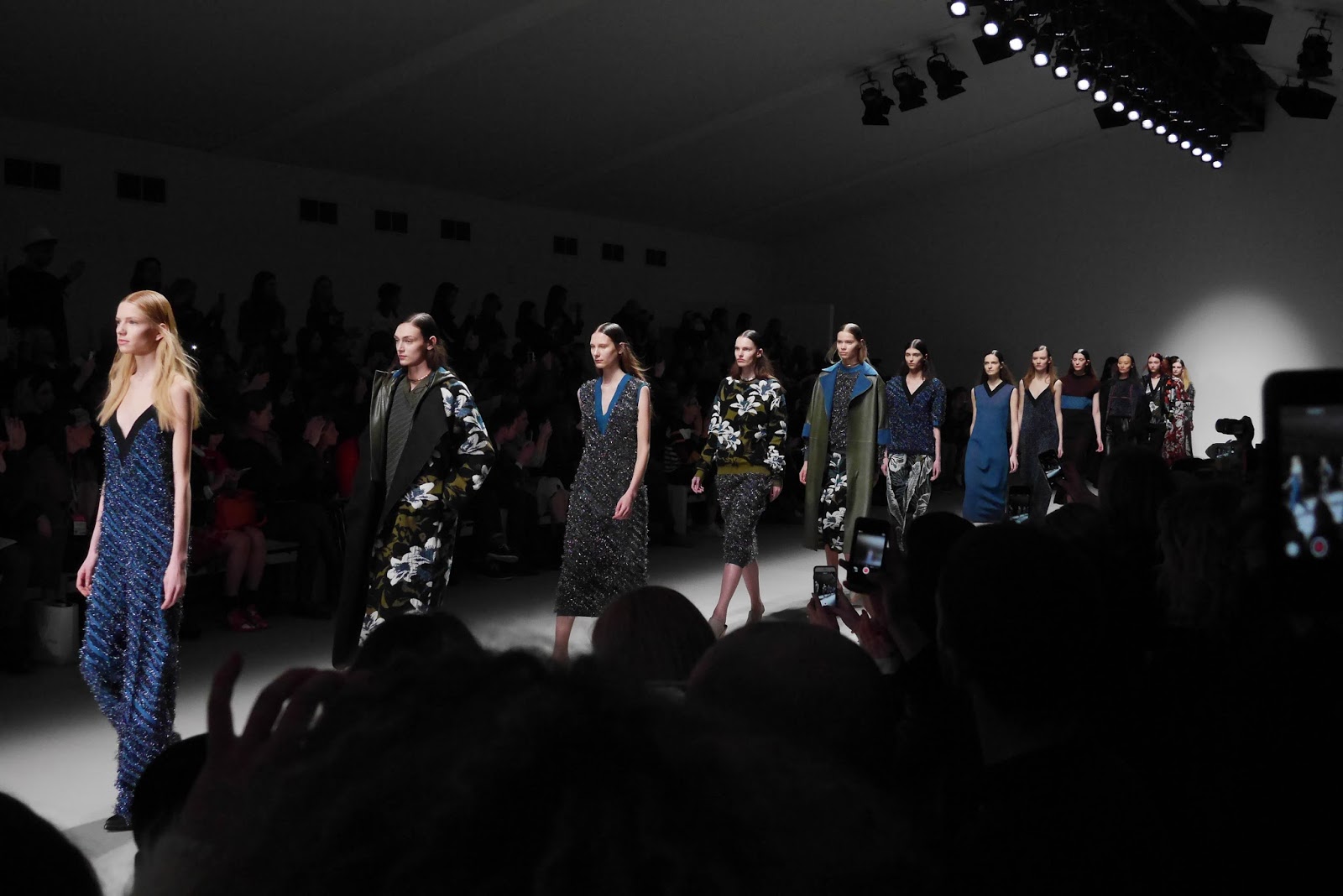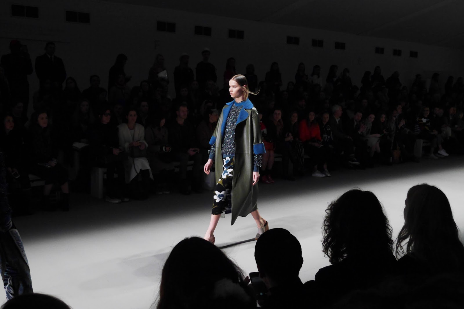 Lucas Nascimento’s particular collection mixed the royal shades through the floral foliage prints and patterns, sometimes incorporating blocks of colour to collars and cuffs. Leathers and silks were seen throughout, with an interesting textured tinsel fabric to jumpsuits, dresses and camis. With a fully lit catwalk and a crowd in shadow, the collection was given centre stage, and rightly so.