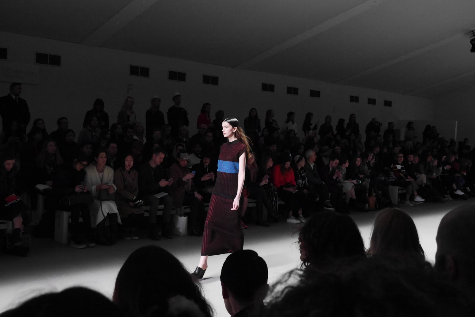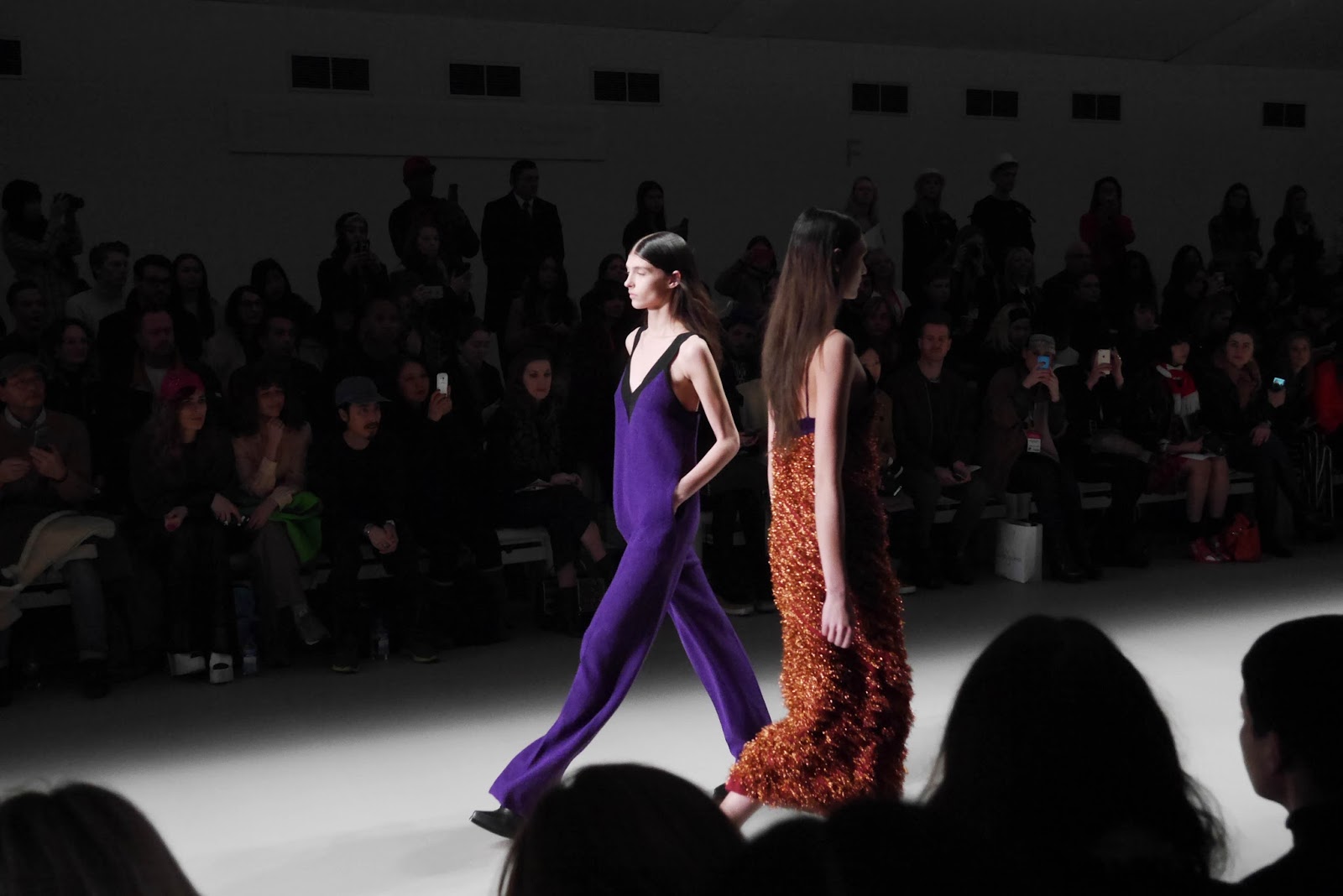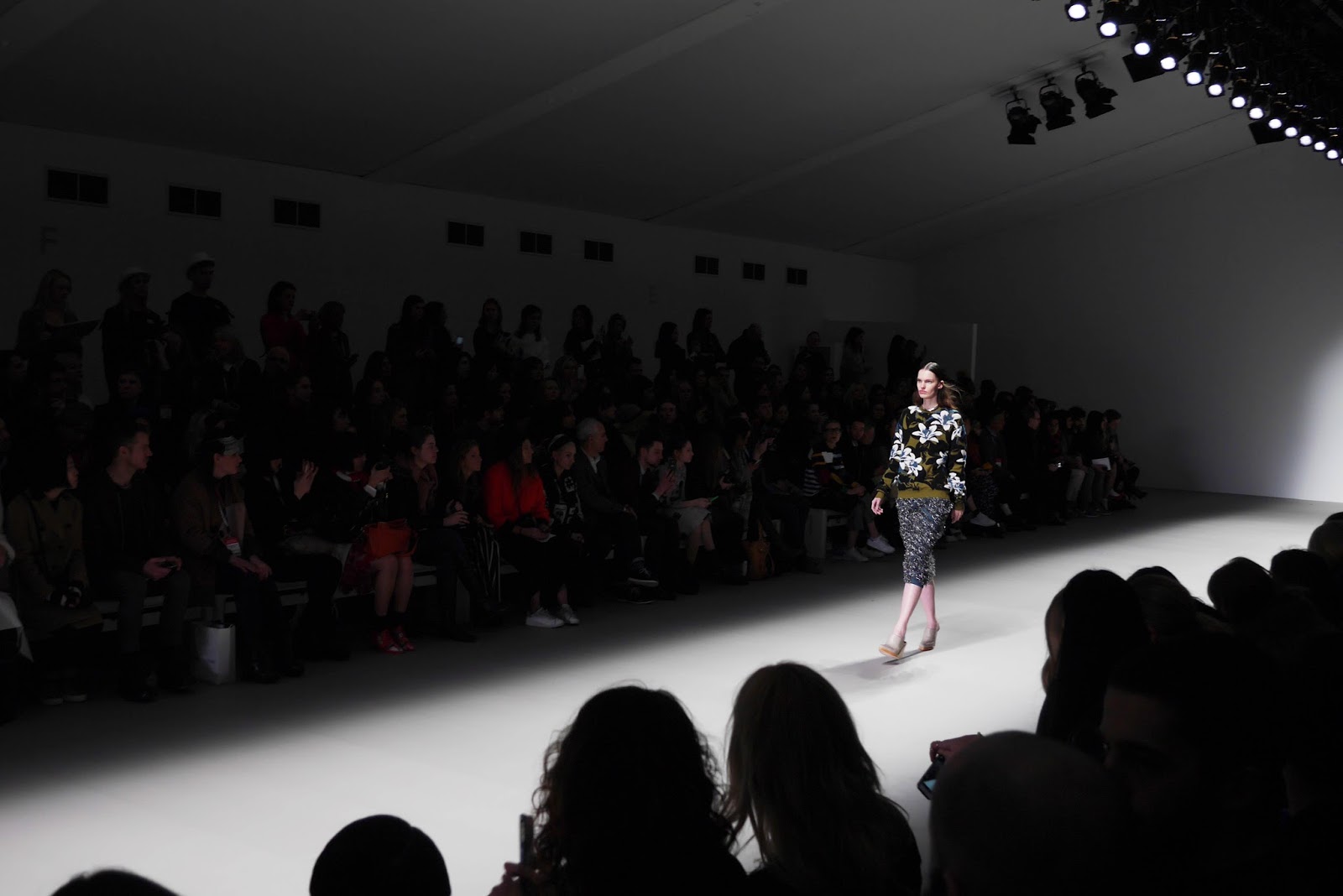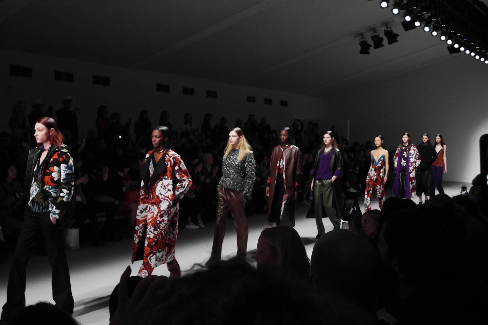 Lucas Nascimento’s particular collection mixed the royal shades through the floral foliage prints and patterns, sometimes incorporating blocks of colour to collars and cuffs. Leathers and silks were seen throughout, with an interesting textured tinsel fabric to jumpsuits, dresses and camis. With a fully lit catwalk and a crowd in shadow, the collection was given centre stage, and rightly so.
