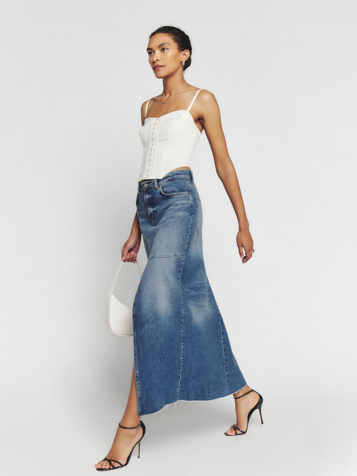 The daring front split, the detailed darting, the raw denim edging - it's the denim midi skirt back again but with a Scandinavian twist. If the trend is intriguing and your closet is missing the hot piece of the season, here's the best of the look available right now.